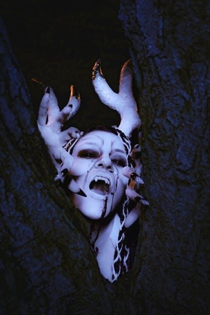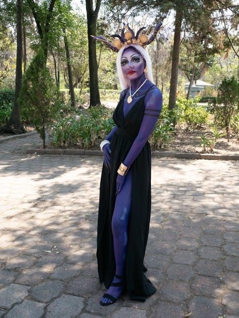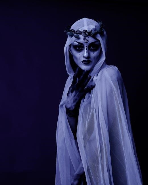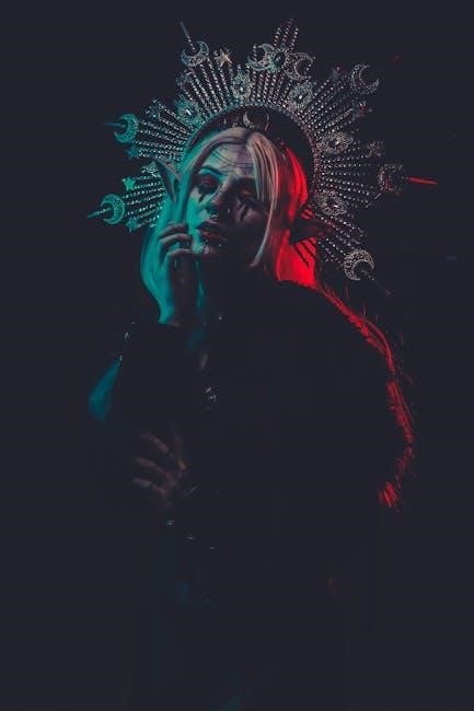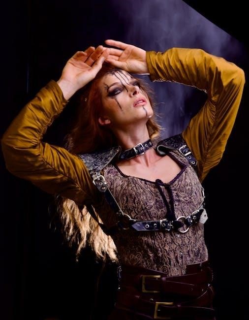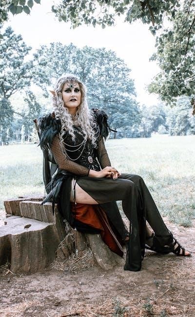 The PDF documentation highlights her drow heritage, granting her advantages like darkvision and innate spell-like abilities. Her rogue class emphasizes stealth, deception, and combat prowess, reflecting the survival instincts necessary within drow society. The character’s detailed stats and backstory provide a tangible representation of the challenges and opportunities faced by drow individuals.